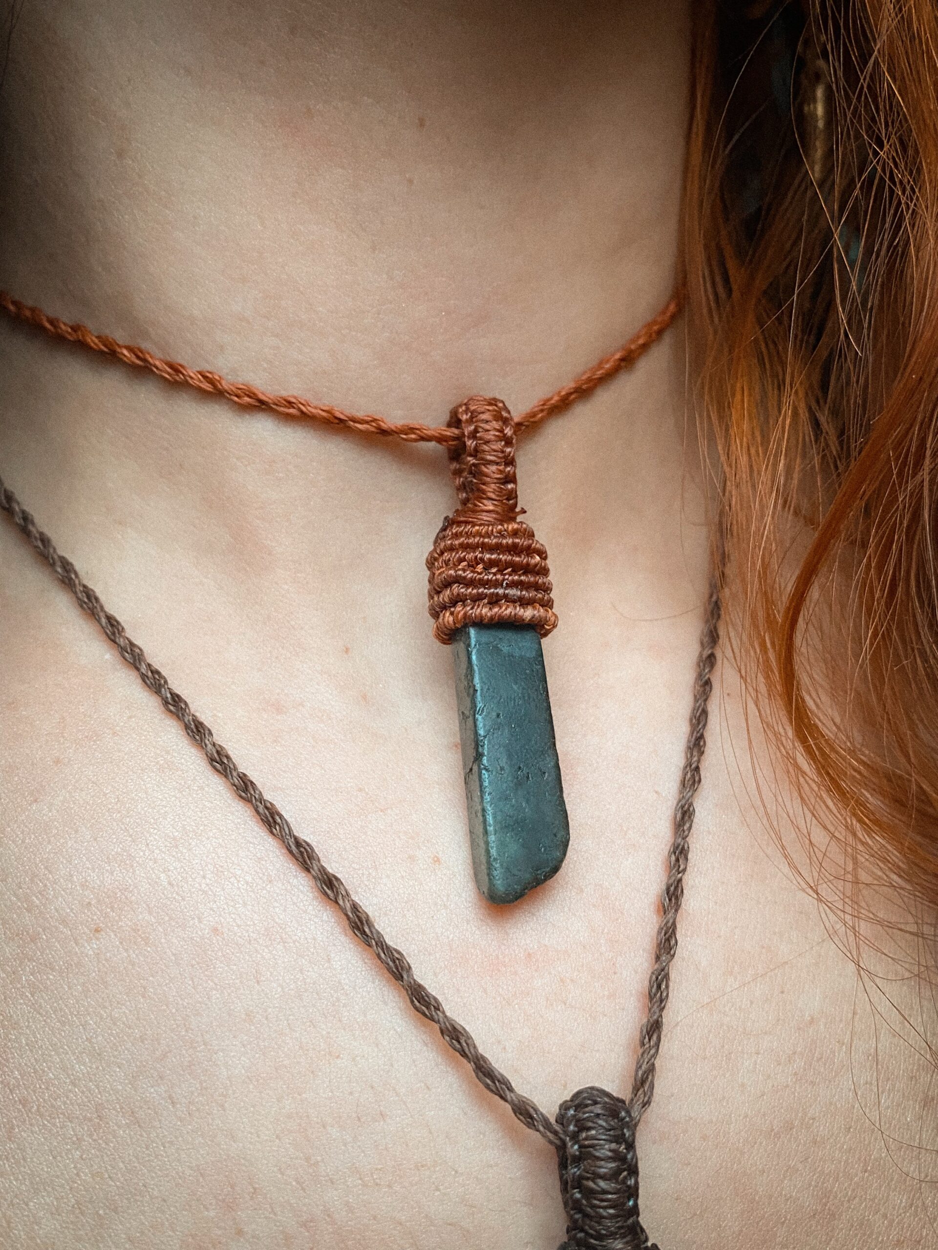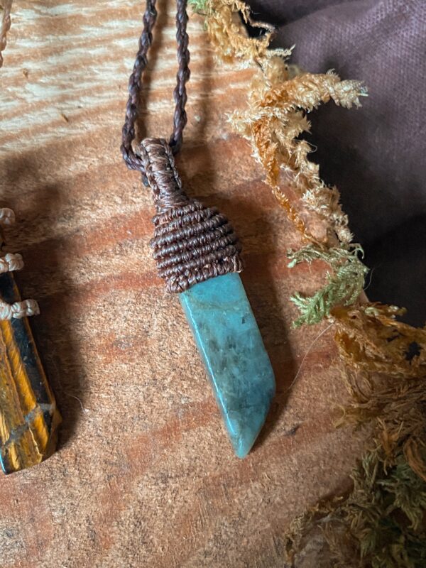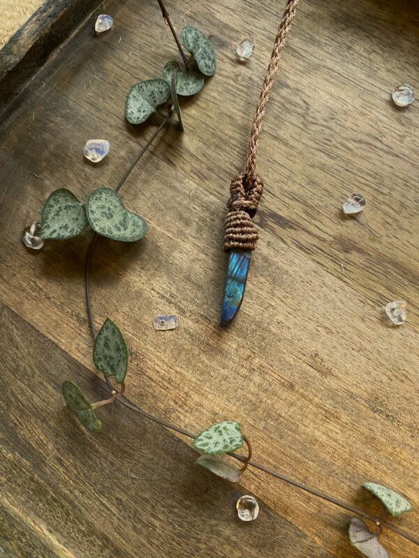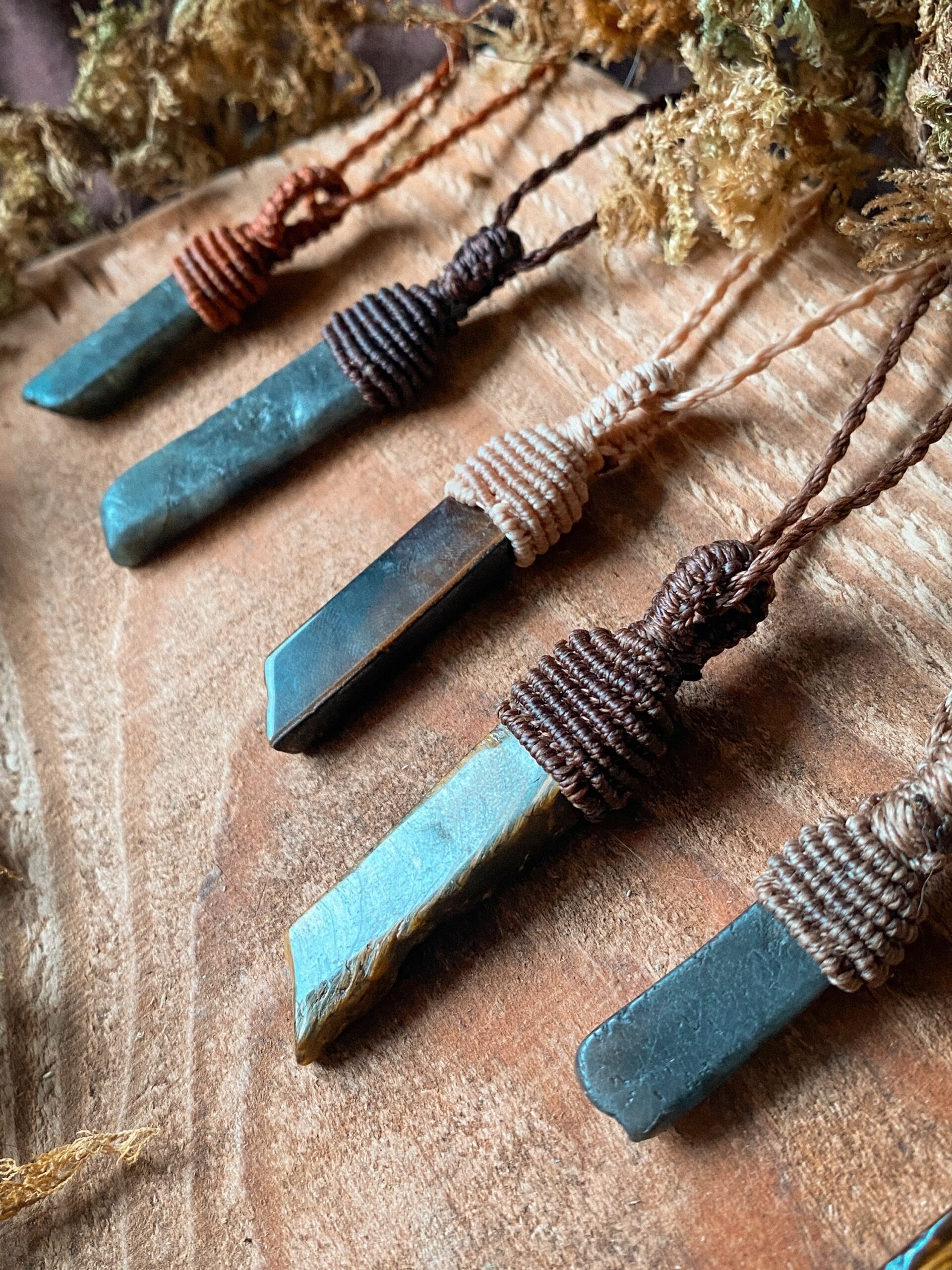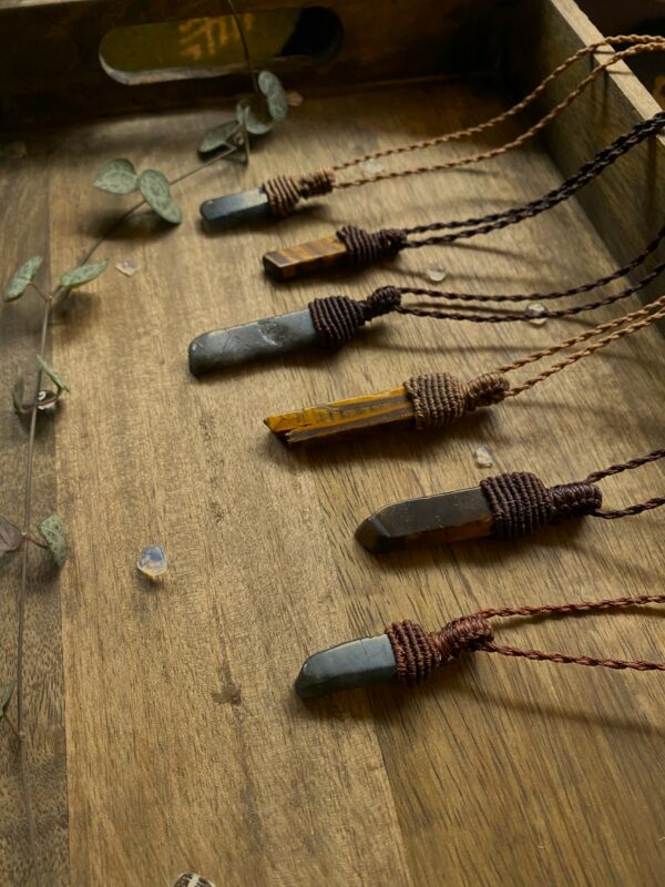 Colliers tissés à la main, pendentif en pierre d’œil du tigre et labradorite. Ils sont réglables par un nœud coulissant pour s’adapter à toustes.
