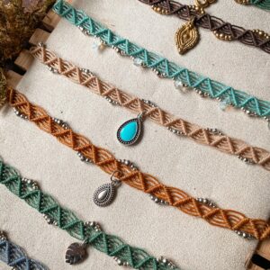 Colliers ras de cou en micro-macramé, réglables par un nœud coulissant.