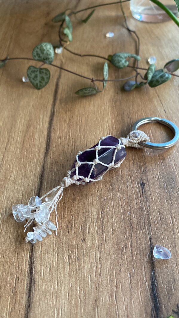Porte-clefs en micro-macramé avec une pointe d’Améthyste. Perle d’agate.